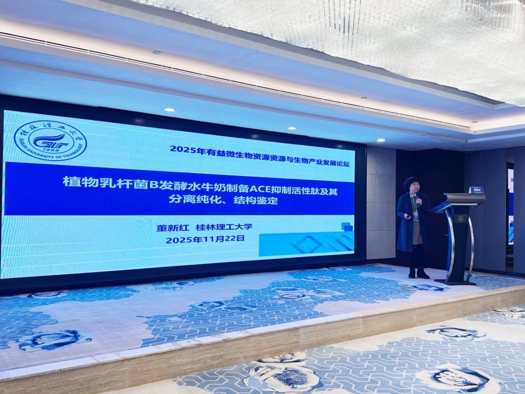 11月21—24日,由广西乡村振兴产业技术研究院、中国微生物学会微生物资源专业委员会等共同主办的“2025有益微生物资源与生物产业发展论坛”在广西防城港市举办。我院李霞副院长带队,教研室主任李静、副主任汤兵、董新红教授及研究生高梦洁、李琪等一行参会,并开展学术交流。会议围绕有益微生物资源的挖掘、功能解析与产业化应用展开,来自科研院所、高校及企业的代表齐聚一堂,共同探讨生物产业发展趋势。 会上,董新红教授作《植物乳杆菌发酵水牛奶制备ACE抑制活性肽及其结构研究》分会报告,展示团队在功能活性肽开发领域的研究成果。李静副研究员作《五指毛桃内生菌分离筛选与活性研究》报告,介绍团队在特色资源微生物挖掘与活性利用方向的工作。两位研究生在研究生论坛进行学术汇报,体现了我院青年科研力量在相关领域的探索与积累。 会议期间,我院参会教师与多家科研机构及企业专家围绕技术转化、应用场景拓展等议题进行了深入交流,对推动科研成果融入地方优势特色产业形成了新的合作意向。 本次参会进一步加强了我院与自治区微生物产业创新力量的联动,对拓展生物资源利用、促进成果转化及服务广西生物医药和食品产业发展具有积极作用。学院将持续聚焦地方产业需求,推进产学研用协同创新,为区域生物产业高质量发展提供人才支撑和技术贡献。 董新红教授分会报告 李静副研究员作报告 大会合影 (一审:汤兵 二审:马文硕 三审:李霞)