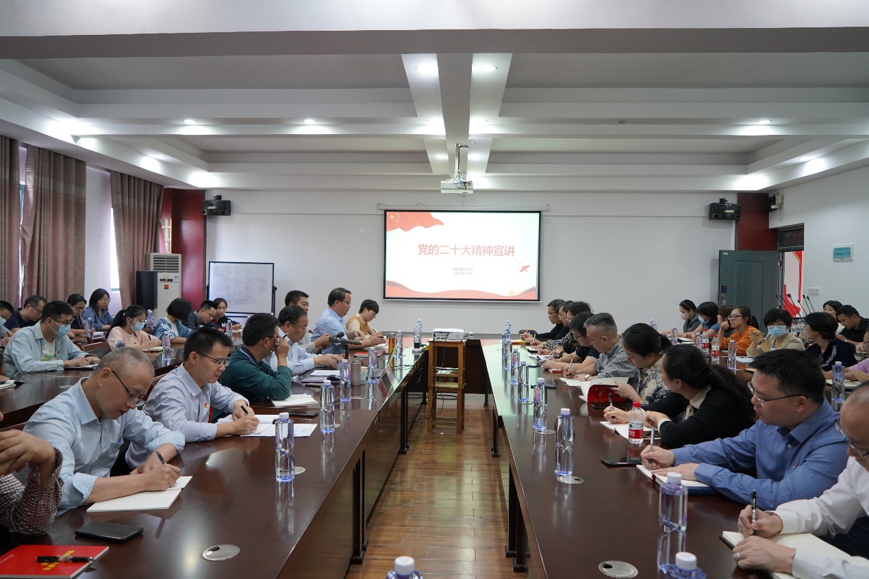 导航痕迹 当前位置: 首页 >> 党建工作 >> 党建工作 >> 正文 梁福沛副校长到我院作党的二十大报告辅导报告 作者:刘耀明 发布日期:2022-11-10 浏览次数: 为深入学习宣传贯彻党的二十大精神,2022年11月9日下午,在雁山校区12407会议室,学校党委常委、副校长梁福沛为我院师生作《党的二十大精神宣讲》的专题辅导报告会。我院全体党政领导班子成员,师生代表以及有关部门教师代表参加了报告会,会议由学院党委书记彭代江主持。 梁福沛副校长结合自己的学习体会,从深刻领会新时代10年的伟大变革,全面建设社会主义现代化国家必须坚持的重大原则和重大部署等方面,深入阐释了如何全面准确学习领会党的二十大精神。他指出,我们要深刻领悟“两个确立”的决定性意义,增强“四个意识”、坚定“四个自信”、做到“两个维护”。 通过聆听报告,我院教师进一步加深了对党的二十大精神实质的理解,提高了政治站位,深化了学术思考。 报告会现场(一) 报告会现场(二) 上一条:我院召开意识形态工作专题会议 下一条:我院召开意识形态工作专题会议
