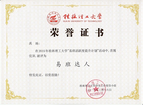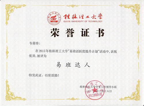 在学校易班个人活跃度评比中,共有20名同学获“易班达人”称号,我院化学类2015-5班黄国铕、2014-2班谢振辉、化学类2015-4班韦葵珍等6名同学荣获此奖项。