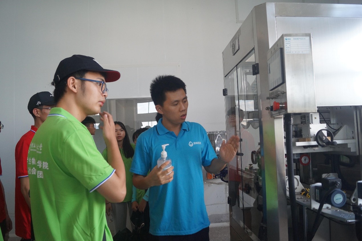 随后,实践团成员参观了医用消毒产品的生产车间。车间内每一位辛勤劳动的工作人员,都为医药事业奉献了自己的一份力量。在工作人员带领下,队员们学习了解了整个产品的加工过程,并且体验免洗手液等产品。