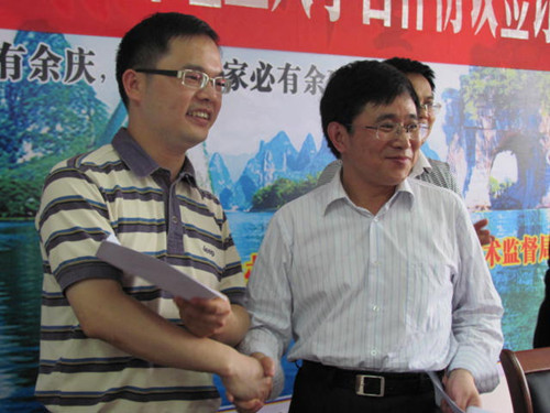 李建平院长(右)和广西饮料产品质量监督检验中心主任陈德勇(左)签订合作协议
