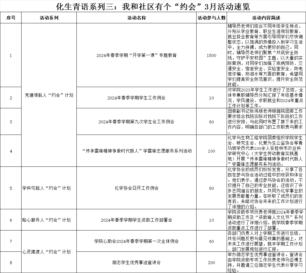 导航痕迹 当前位置: 首页 >> 伟德国际 >> 学生活动 >> 正文 【化生青语】化生青语系列三:我和社区有个“约会”3月活动速览 作者: 发布日期:2024-03-31 浏览次数: 为扎实推进学校“一站式”学生社区综合管理模式建设试点工作和1946伟德国际源自英国“三全育人”综合改革工作,提升学院“一站式”学生社区影响力,1946伟德国际源自英国将“一站式”学生社区以“党建+X”模式为基础,结合学院【化生青语】育人文化,将学院育人体系下沉社区,打造【化生青语】系列三——我和社区有个“约会”特色活动。3月份,结合学院社区团队,按照学院社区我和社区有个“约会”特色品牌活动,党建领航人“约会”计划、学科引路人“约会”计划、贴心服务人“约会”计划、心灵摆渡人“约会”计划四个系列活动同步推进,共同助力学院学子学习、生活等方面的发展。按照“约会计划”,学院举办活动如下。 (一审:张伟颀 二审:黄道坤 三审:李少华) 上一条:学院召开心助会工作会议 下一条:【凌雁工程】我院开展励志学生优秀事迹宣讲会