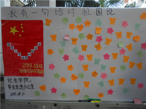 导航痕迹 当前位置: 首页 >> 伟德国际 >> 共青团 >> 正文 【“三爱”主题教育年】我院开展十月爱国主义教育月之“我有话对祖国说”活动 作者: 发布日期:2015-07-19 浏览次数: 为弘扬爱国主义精神,充分表达学生对祖国的爱国情怀,10月10日,我院学生党建办公室组织在学生社区组织开展了“我有话对祖国说”便笺留言展示活动。 活动现场,党建办公室工作人员把前期收集好的便笺留言张贴到展板上供同学们浏览,阅读,同时也让同学们现场留言,寄托自己对祖国的热爱之情,获得得到同学们的积极参与,现场气氛热烈。 此次“我有话对祖国说”是我院十月爱国主义教育月的子活动之一。一句话可能无法道尽同学们对祖国母亲强烈的爱意,但说得多不如做的多,努力学习,不断完善自我,为祖国的未来积蓄力量,为服务更广大人民而奋斗,用实际行动表达自己的爱国情宜是真正的爱国体现! 活动现场 同学们写下的对祖国的祝福 上一条:【新生导航计划】新生唱响校歌 下一条:【新生导航计划】让青春起航 为梦想奋斗
