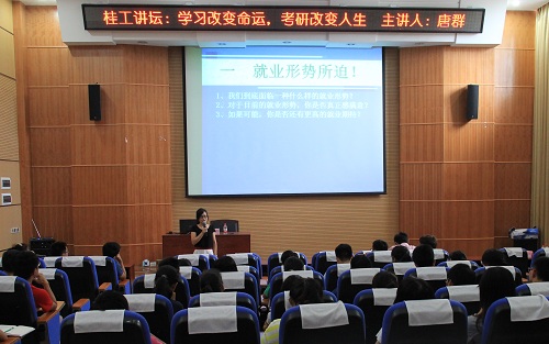 导航痕迹 当前位置: 首页 >> 新闻资讯 >> 学院新闻 >> 正文 【桂工讲坛】我院唐群博士应邀做题为“学习改变命运,考研改变人生”专题讲座 作者: 发布日期:2015-06-18 浏览次数: 为进一步提高我院学生的考研热情,鼓励同学们追求更高的人生目标,6月17日下午,我院唐群博士受邀在雁山校区12报告厅做了题为“学习改变命运,考研改变人生”的专题讲座。学院2012级、2013级、2014级同学参加了本次讲座。 会上,唐群博士鼓励同学们要“胸怀大志,锐意进取”,要为了更高的人生追求努力备战。接着她从自身的发展轨迹,为同学们分析了考研对于自身长期发展的重要性。最后,唐群博士简要介绍了考研的流程和考研的复习准备,并强调了考研的两个关键点:一是要做好充足的心理准备;二是坚持信念不动摇,难得住寂寞,挺得住困难。此次讲座在同学们的掌声中圆满结束。 本次专题讲座的举办引发了同学们对考研更深层次的思考,对同学们今后的学习、就业具有指导意义。 讲座现场 上一条:【桂工讲坛】广东猛狮科技人力资源总监阮小滔做客桂工讲坛 下一条:朋辈领航,助力梦想――我院举行考研经验交流会