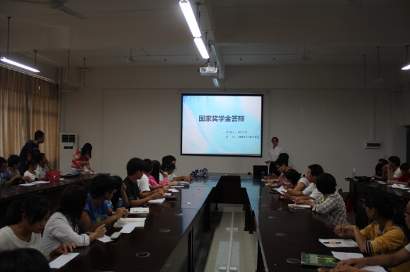 导航痕迹 当前位置: 首页 >> 新闻资讯 >> 学院新闻 >> 正文 我院举办2012-2013学年度国家奖学金答辩会 作者: 发布日期:2013-10-09 浏览次数: 为了充分体现国家奖学金评选工作的公正公开公平原则,给我院学生提供一个展现自我、互相交流的平台,我院于10月8日中午在12209 教室举行2012-2013学年度国家奖学金答辩会。学院党委副书记陶剑飞与各年级辅导员担任嘉宾,各班级同学代表一起参加了答辩会并担任大众评委。 答辩会上,七名候选同学依次上场,通过PPT现场解说的方式向大家展现自己优异的成绩以及丰富多彩的科技活动、社会实践以及大学校园文化生活,选手展示完毕后,还有现场观众提问环节,让在场同学与国家奖学金答辩人进行互动交流。整场答辩会历时一个小时,选手们用积极向上、乐观自信的精神风貌为大家展示了一幅幅写满辉煌的大学画卷,精彩的表现博得大家的热烈掌声。答辩会最后,陶剑飞副书记发言,她充分肯定了各位答辩选手所作出的努力,并表示感谢,同时陶副书记也指出了答辩过程中的一些不足,并希望在场同学能够从本次答辩会中向优秀的人学习,借鉴经验,在自己的今后大学生活中有所收获,同时她也希望今后能有更多的优秀同学能参与到国家奖学金答辩会中来,为大家展示自己最精彩的一面。 据悉,本次国家奖学金的评比结果将采用嘉宾评委打分以及大众评委打分两个板块综合得出。本次国家奖学金答辩会的举办,不仅锻炼了答辩选手的表现能力,也为我院广大学生树立了学习的榜样,营造了一种创先争优、拼搏上进的良好氛围。同时这也体现了我院对国家奖学金评选工作的高度重视,为国家奖学金的评比能够公平公正公开地进行提供了良好的保障。学院党委副书记陶剑飞发言答辩会现场 上一条:我院2012级化学工程专业学位硕士研究生开题答辩和中期筛选 下一条:我院举行“卓越工程师教育培养计划”班面试会