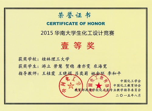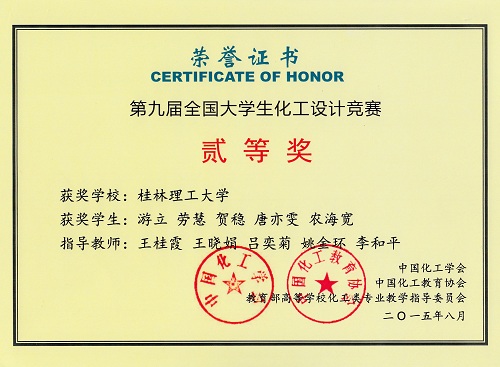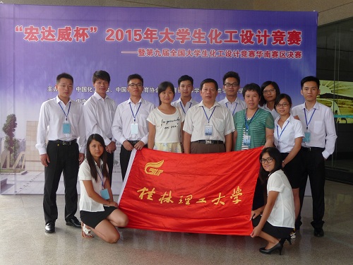我院组织化学工程与工艺专业2012级21支队伍参加了第九届全国大学生化工设计竞赛,在李和平、王桂霞、刘峥、王晓娟、吕奕菊、姚金环等老师指导下,取得本届大赛优异成绩,共获得全国总决赛二等奖1项(华南赛区决赛壹等奖)、三等奖3项、华南赛区决赛三等奖7项。为我院历届参赛队伍(21支队伍,11支获奖)与获奖数量(获奖总计13项)最多的一届大赛。获奖名单与成绩如下:表1 第九届全国大学生化工设计竞赛获奖作品与成绩