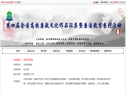 为在广大学生中深入开展廉政教育,紧紧围绕立德树人根本任务,积极培育和践行社会主义核心价值观,进一步推进高校廉政文化建设和廉洁教育工作,我院积极参加教育部办公厅举办第四届全国高校廉政文化作品征集暨廉洁教育系列活动,选送作品《光环的背后》参赛获新媒体视频类入围奖。