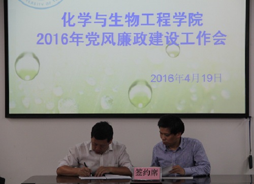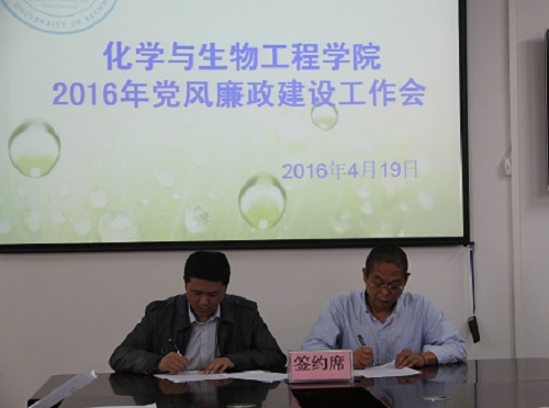 学院党委书记梁军(右)与生物工程教工党支部书记李培骏(左)签订2016年党风廉政责任状