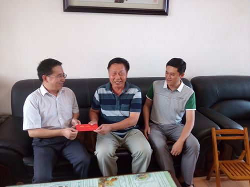 梁军书记(右)、陶剑飞副书记(左)慰问退休教师胡祖生(中)