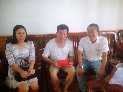 李建平院长(左)、潘宏程副院长(右)慰问退休教师刘长久(中)