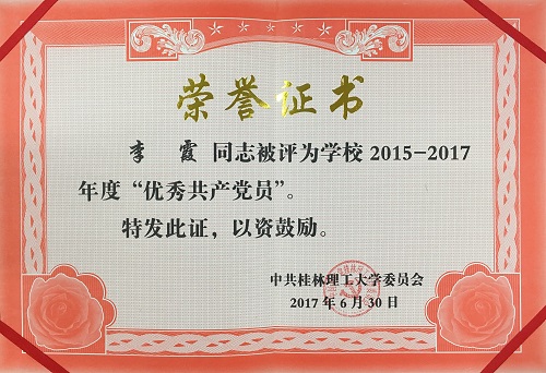 导航痕迹 当前位置: 首页 >> 新闻资讯 >> 学院新闻 >> 正文 我院部分党员在学校“庆祝中国共产党成立96周年主题党日活动暨先进表彰大会“获得表彰 作者:李冲 发布日期:2017-07-02 浏览次数: 6月30日下午,我校在屏风校区体育馆三楼举行庆祝中国共产党成立96周年主题党日活动暨先进表彰大会。校党委书记张学洪在会上讲话,校长解庆林主持会议,党委副书记王赣华宣读表彰决定,党委副书记、纪委书记孙宁宣布学校党风廉政建设优秀成果评选结果。校领导梁福沛、曾繁荣,全体教工党员,学生党员代表,民主党派和无党派人士代表参加会议。 会上,学校对获得2015-2017年度先进的10个基层党组织、45名优秀共产党员、10名优秀党务工作者,以及14个党风廉政建设优秀成果获奖单位、11个庆祝建党96周年主题党日活动获奖单位进行表彰。我院陶剑飞副书记获得“优秀党务工作者”荣誉称号;李霞、何宗辉获得“优秀共产党员”荣誉称号。 荣誉证书(一) 荣誉证书(二) 荣誉证书(三) 上一条:我院召开2017年春季末学期班主任工作会议 下一条:我院何宗辉老师参加高校创业指导师专题培训班
