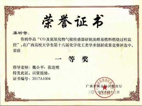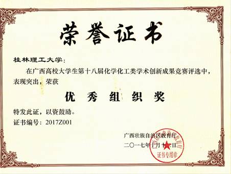 导航痕迹 当前位置: 首页 >> 新闻资讯 >> 学院新闻 >> 正文 我院学子在广西高校大学生第十八届化学化工类学术创新成果竞赛中喜获佳绩 作者:邹志明 发布日期:2017-12-12 浏览次数: 近日,从自治区教育厅《关于公布广西高校大学生第十八届化学化工类学术创新成果竞赛结果的通知》(桂教高教〔2017〕59号)获悉,我院在广西高校第十八届化学化工类学术创新成果竞赛中取得了一等奖1项、二等奖4项、三等奖3项的佳绩,学校获得优秀组织奖。 本届竞赛由广西教育厅举办,全区27所高等院校,3000多名在校大学生参加此次竞赛。经评审委员会专家评审,确定一等奖论文10篇,二等奖论文30篇,三等奖论文50篇。从2000年开始至今,教育厅每年举办一届竞赛,现在已经连续举办18届竞赛。 优秀组织奖证书 一等奖证书 颁奖现场 上一条:梁福沛副校长带队参加2017年广西高等教育学会化学化工类专业委员会暨化学院(系)院长、主任会议 下一条:我院召开本科教学督导工作总结交流会