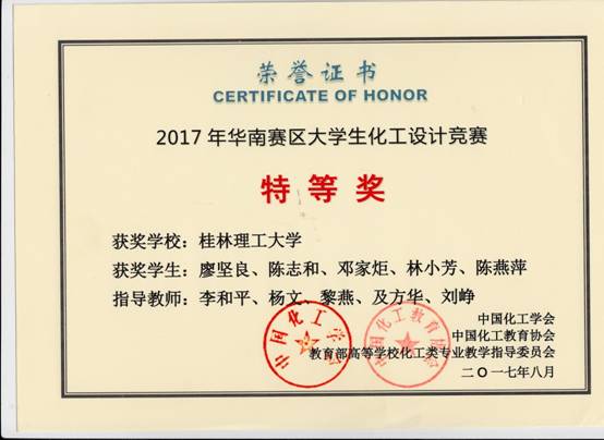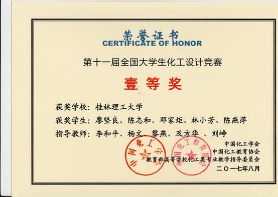 由中国化工学会、中国化工教育协会、教育部高等学校化工类专业教学指导委员会主办的第十一届全国大学生化工设计竞赛今年分别在珠海中山大学、杭州浙江大学进行了华南赛区、全国总决赛。我院一共组成了17支队伍参赛,由李和平、吕奕菊、王晓娟、黎燕、王桂霞、姚金环、杨文、冯艳艳、刘峥、及方华等老师组成的团队进行指导。2014级卓越班本科生廖坚良、陈志和、邓家炬、林小芳、陈燕萍组成的代表队设计的作品“NHD脱硫-甲醇合成法年产4.5万吨甲硫醇项目设计”经过师生共同努力,以其出色的设计作品和精彩的现场答辩脱颖而出,勇夺赛区特等奖;并以广西高校唯一的一支队伍进入全国总结赛,荣获全国总决赛一等奖。同时,我校还获得全国贰等奖1项、叁等奖5项、华南赛区叁等奖7项,在获奖比例与数量上均为历届参赛最好成绩。获奖情况如下: