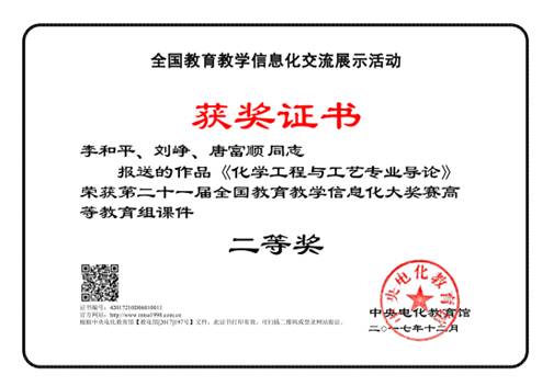 临近2018年元旦,我院教师李和平、刘峥、唐富顺的作品“《化学工程与工艺专业导论》多媒体课件”在第二十一届全国教育教学信息化大奖赛中荣获高等教育组课件二等奖。