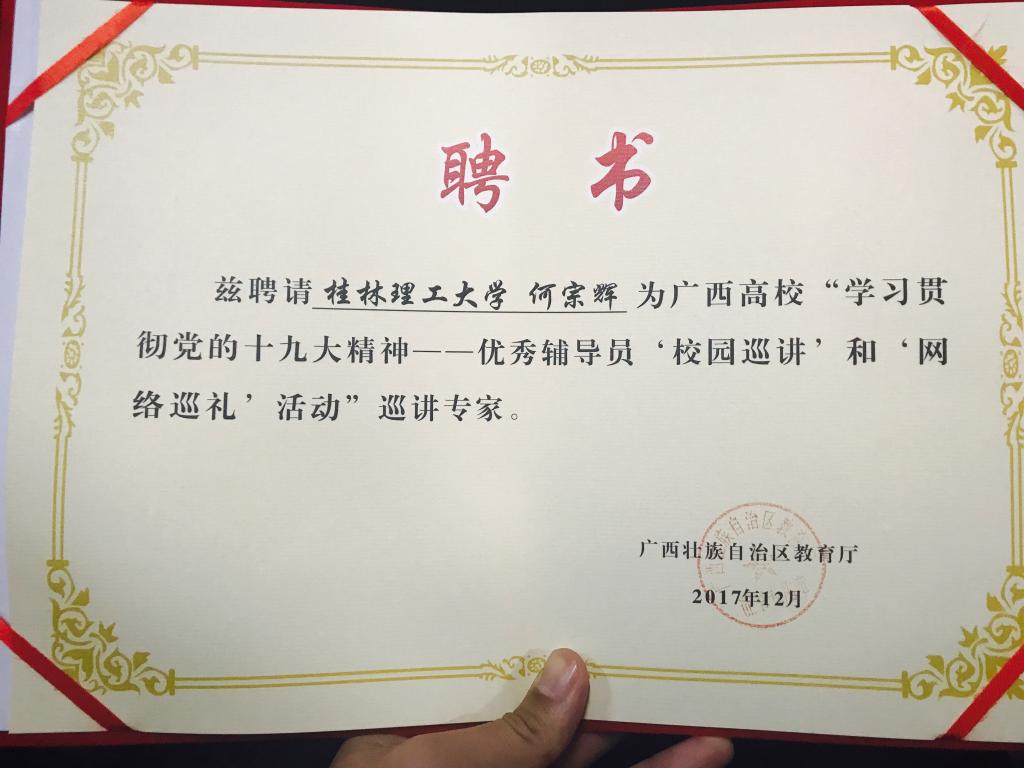 为推进全区高校深入学习宣传贯彻党的十九大精神,根据教育部和自治区高校工委有关部署要求,广西区教育厅组织开展了广西高校“学习贯彻党的十九大精神——优秀辅导员‘校园巡讲’和‘网络巡礼’活动”,自治区教育厅从全区高校获得历届全国高校辅导员年度人物入围奖及全区高校辅导员职业能力大赛一、二、三等奖的优秀辅导员中遴选29名优秀辅导员,我校共四位辅导员入选本次区级宣讲团,其中,我院团委书记饶筠筠、辅导员何宗辉入选宣讲团名单,并受聘为广西高校“学习贯彻党的十九大精神——优秀辅导员‘校园巡讲’和‘网络巡礼’活动”巡讲专家。”