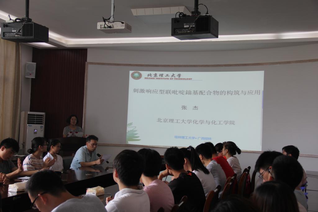 6月17日,应我院邀请,北京理工大学张杰教授在雁山校区12217多功能室作了题为“刺激响应型联吡啶鎓基配合物的构筑与应用”的学术报告。我院相关专业师生聆听了此次报告。报告会由学院副院长张淑华主持。