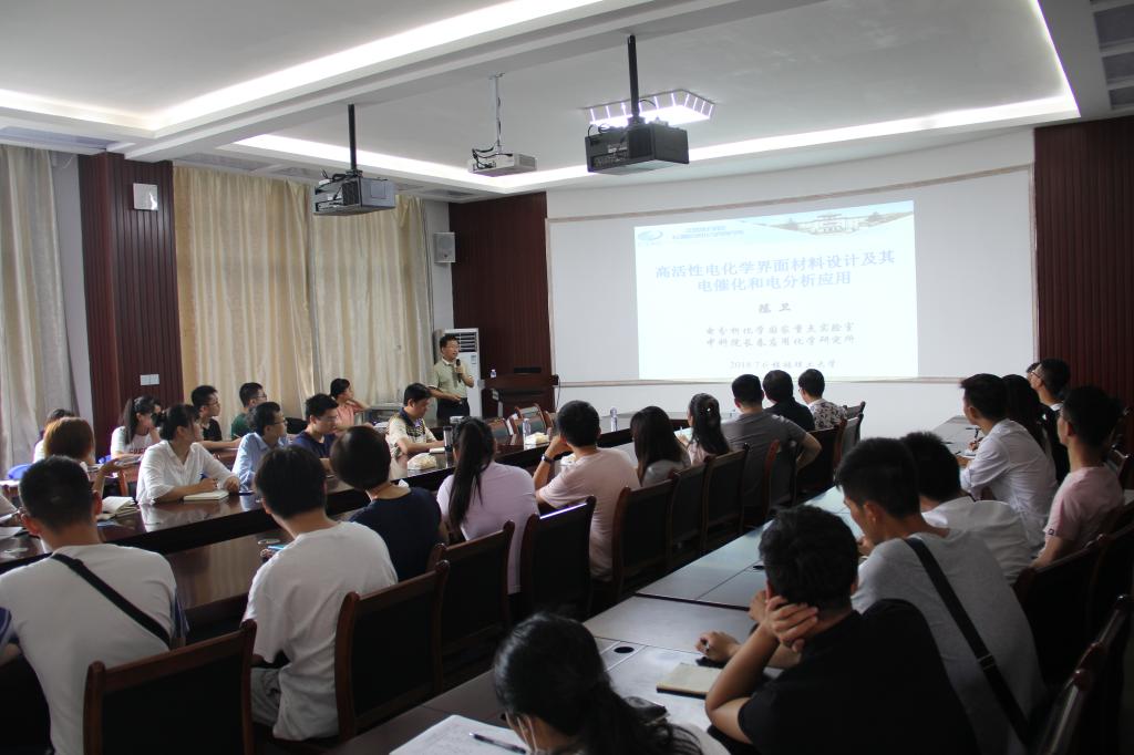 导航痕迹 当前位置: 首页 >> 新闻资讯 >> 学院新闻 >> 正文 中国科学院长春应用化学研究所陈卫研究员到我院讲学 作者:袁敏 发布日期:2018-07-06 浏览次数: 7月6日上午,应我院邀请,中国科学院长春应用化学研究所陈卫研究员在雁山校区12217多功能室作了题为“高活性电化学界面材料设计及其电催化和电分析应用”的学术报告。我院相关专业师生聆听了此次报告。 报告中,陈卫研究员就电化学材料研究背景、电化学电源、电化学及生物传感器、电催化剂存在的主要问题以及其解决方法等方面做了介绍。他重点讲解了纳米结构的制备过程及其反应过程的机理,并详细分析了贵金属纳米团簇尺寸、荷电状态、活性位点等对电催化活性和稳定性的影响。陈研究员还介绍他的课题组在相关领域所取得的研究成果。在互动环节,师生们踊跃提问,陈卫研究员一一给出了细致解答。 本次学术报告会加深了师生们对高活性电化学界面材料设计及其电催化和电分析应用等研究领域的了解,对今后的学习和研究具有积极意义。 陈卫研究员在作学术报告 学术报告会现场 上一条:我院召开专业认证工作会 下一条:中国科学院长春应用化学研究所陈卫研究员学术报告