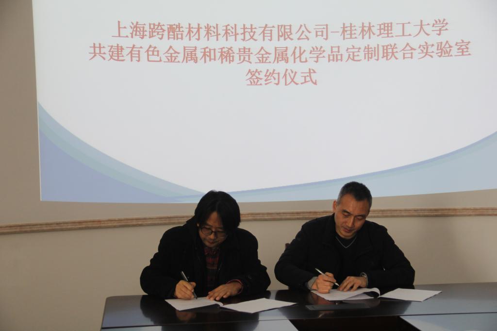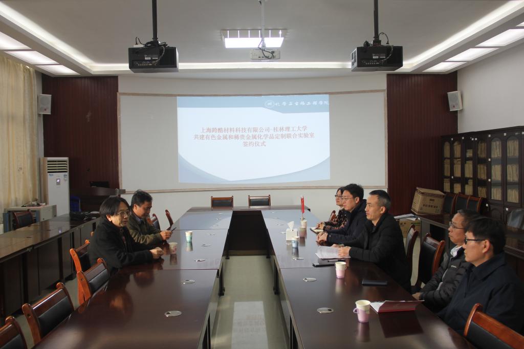 12月22日上午,我院与上海跨酷材料科技有限公司(以下简称公司)在雁山校区12217多功能室举行签订共建有色金属和稀贵金属化学品定制联合实验室协议仪式。上海跨酷材料科技有限公司董事长王安之博士、我院党委书记梁军、副院长何方、刘勇平以及部分公司代表、教师代表参加了签约仪式。签约仪式由学院副院长何方主持。
