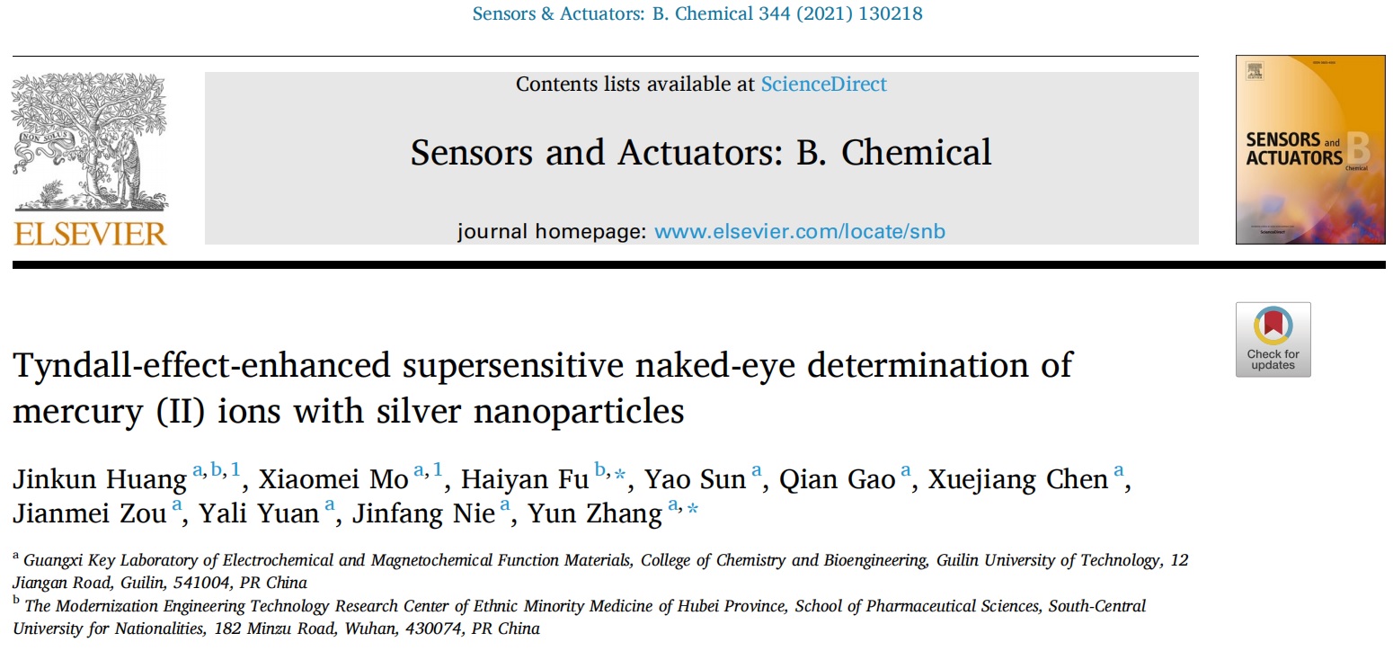 近日,我院张云教授课题组和中南民族大学付海燕教授课题组合作,在即时检测(Point-of-care testing,POCT)研究领域再次取得重要进展。相关成果以“Tyndall-effect-enhanced supersensitive naked-eye determination of mercury (II) ions with silver nanoparticles”为题发表在化学与生物传感领域国际著名期刊Sensors and Actuators B: Chemical(SCI一区TOP,影响因子为7.10)上。该项研究得到国家自然科学基金面上项目、广西杰出青年基金、中央引导地方科技发展资金、广西重点研发计划等项目资助。我院硕士研究生黄锦坤、莫小梅为论文共同第一作者,伟德国际1946源于英国为第一通讯单位,张云教授和付海燕教授为共同通讯作者。