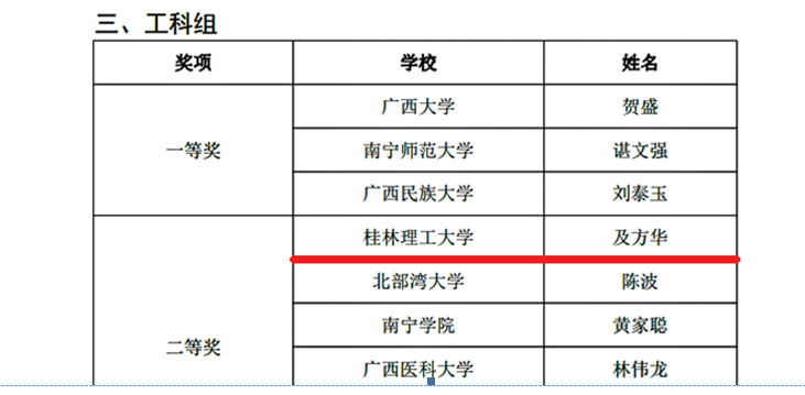导航痕迹 当前位置: 首页 >> 新闻资讯 >> 学院新闻 >> 正文 喜讯!我院及方华副教授在第九届全区高校青年教师教学竞赛中喜获工科组二等奖 作者:梁芳群 发布日期:2022-09-10 浏览次数: 近日,自治区教育厅、自治区总工会联合下文《自治区教育厅自治区总工会关于公布第九届全区高校青年教师教学竞赛获奖名单的通知(桂教教师〔2022〕43号)》,公布了第九届全区高校青年教师教学竞赛获奖名单,我院及方华副教授获工科组二等奖。 青年教师是高校本科教育教学的生力军,我院一直重视青年教师教学比赛,通过以赛促教、以赛促学、以赛促练机制,鼓励青年教师开拓进取,不断钻研教育教学业务,提升教学质量。学院将以此次获奖为契机,充分发挥获奖教师的示范引领作用,进一步激励青年教师潜心教学、提高教育教学水平,有效地助力学校本科教育教学工作质量不断提高。 上一条:我院召开全院教工大会 下一条:喜迎党的二十大 培根铸魂育新人 ——1946伟德国际源自英国庆祝2022年教师节活动