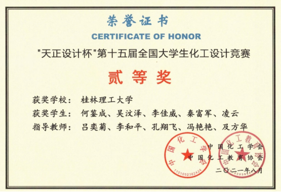 导航痕迹 当前位置: 首页 >> 教育教学 >> 化学工程专业认证 >> 正文 我院学子在2021年第十五届全国大学生化工设计竞赛中再创辉煌 由中国化工学会、中国化工教育协会、教育部高等学校化工类专业教学指导委员会主办的第十五届全国大学生化工设计竞赛华南赛区决赛由湖南湘潭大学于2021.8.3-5进行了线上承办。本次设计任务“为某大型化工企业设计一座异丙醇生产分厂或为现有的异丙醇生产分厂设计技术改造方案。相对现有生产装置的技术水平,要求技术提升达到《中国制造 2025》中提出的绿色发展 2025 年指标。” 设计任务包括工艺设计、管道设计、自控设计、设备设计选型、厂区布置、经济概算、可行性分析等。全方位考查和提升了化工学科领域学生的创新意识、对化工知识的综合运用能力,同时也进一步增强了学生的环保意识、人文关怀意识和社会责任感。 我院组织化学工程与工艺专业2018级26支队伍参赛,由李和平、吕奕菊、王晓娟、黎燕、王桂霞、姚金环、杨文、冯艳艳、刘峥、及方华等老师组成的团队进行指导。2018级卓越班本科生何鉴成、吴汶泽、李佳威、秦富军、凌云组成的代表队设计的作品“南京扬子石化有限公司年产8万吨异丙醇” 经过师生共同努力,以其出色的设计作品和精彩的线上现场答辩脱颖而出,勇夺赛区一等奖,荣获全国总决赛二等奖。同时,我校还获得全国二等奖1项、三等奖5项、华南赛区三等奖7项,在获奖比例与数量上均为历届参赛最好成绩。获奖情况如下: 表1 第十五届全国大学生化工设计竞赛获奖作品与成绩(伟德国际1946源于英国) 序号 团队名称 设计项目名称 参赛学生 指导教师 获奖等级(全国总决赛) 获奖等级(华南赛区) 1 牛气冲天 南京扬子石化有限公司年产8万吨异丙醇 何鉴成、吴汶泽、李佳威、秦富军、凌云 吕奕菊、李和平、孔翔飞、冯艳艳、及方华 二等奖 特等奖 2 仙乔化工魂 南京扬子石化年产5万吨异丙醇 余浩文、刘欢、尹贇、岳誉华、臧家望 李和平、吕奕菊、何方、唐群、邹志明 三等奖 二等奖 3 烯望工程 中石化镇海炼化化工有限公司年产11万吨异丙醇项目 邱祖文、刘美辰、沈子怡、傅观娇、陈梦香 吕奕菊、 李和平、 杨文、王晓娟、黄红霞 三等奖 二等奖 4 天赋异丙 中石化海南炼化年产20万吨异丙醇项目 邢淋慧、程夏、陈丽萍、胡志辉 吕奕菊、李和平、何方、冯艳艳、滕青湖 三等奖 二等奖 5 五个Pd元素 中国石化仪征化纤股份有限公司年产5万吨异丙醇项目设计 潘朝宇、黎淼、严传汉、黄承敏、林伯照 李世清、 张秀清、 黎燕、谭海军、王晓娟 三等奖 二等奖 6 共用电子 江西九江中石化年产5.2万吨异丙醇 郭雨婷、朱笑萱、刘雪玲、罗雨、李荣珍 李和平、吕奕菊、 及方华、王桂霞、何方 三等奖 ———— 7 千百度 齐鲁石化年产5万吨异丙醇改建 马凯、夏睿、吴富城、王燕、黄远菲 何方、吕奕菊、 李和平、及方华、邹志明 ———— 三等奖 8 向日葵 扬子石化新建年产5万吨异丙醇 寇杨光、张京慧、徐婷、李蕊、唐嘉鑫 何方、王晓娟、 吕奕菊、李和平、蒋光彬 ———— 三等奖 9 五飞小组 广州华隆石化有限公司年产10万吨异丙醇项目 牛元进、曾经宇、牟治颖、翟以祥、雷斌 黎燕、 郭燕军、 谭海军、黄红霞、张秀清 ———— 三等奖 10 剑指苍穹 山东海科有限公司分公司年产24万吨异丙醇项目 黎柏松、庞荣水、曾令航、鲍寒星、吴丽桃 黎燕、谭海军、张秀清、李雪明、李世清 ———— 三等奖 11 欣欣向荣小葵花 江苏飞翔集团凯凌化工(张家港)有限公司年产9.2万吨异丙醇项目 覃淑萍、邓志琳、杨燕平、张文娟、黄华斌 王晓娟、蒋光彬、冯艳艳、杨文、王永涛 ———— 三等奖 图1:国赛二等奖证书 【 发布日期:2021-12-29 浏览次数: 】 上一条:化学化工教研室组织化工2018同学进行参观实习暨毕业设计(论文)进行动员 下一条:化学工程与工艺专业认证中期材料总结会