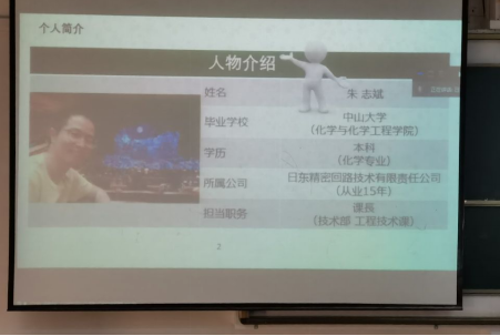 导航痕迹 当前位置: 首页 >> 教育教学 >> 化学工程专业认证 >> 正文 深圳日东精密回路技术有限责任公司技术部工程技术课长朱志斌来我院与化工与制药类2021级同学进行讲座交流 应化工教研室老师的邀请,深圳日东精密回路技术有限责任公司技术部工程技术课课长朱志斌于2021年12月23日下午在雁山05307教室,通过腾讯会议,为我院化工与制药类2021级同学奉献了一场精彩生动的《专业导论(化药类)》线上讲座。 朱课长首先从化学工程与工艺专业的形成讲起,讲了化学学科的分支、化学学科的定义、化学的发展,以中国四大发明和化学验毒的故事为引,给学生讲授了化学在生活中的应用;然后以思维导图为引,讲述了化学工程与工艺专业在国民经济中起重要支撑作用,专业的发展前景不可预期,同时希望同学们热爱自己的专业,即使将来不从事本专业相关的工作,专业知识扎实也会给自己更多成才的机会;最后结合自己在日东精密回路技术有限责任公司中的成长经历,现身说法,讲述了目标在工作成长中的作用,并要为了目标脚踏实地的制定计划,逐步实现自己的目标。“宝剑锋从磨砺出,梅花香自苦寒来”,是朱课长对在座200余名同学的真切寄语。 深圳日东精密回路技术有限责任公司成立于2004年,是一家集开发、检测、生产经营大容量磁盘驱动器及其部件、薄膜金属回路基板、电子配套零部件,并从事上述产品的技术和售后服务,以及电子产品的相关检测服务的企业。 图1 日东精密回路技术有限责任公司朱课长讲座 图2 日东精密回路技术有限责任公司朱课长讲座 【 发布日期:2021-12-24 浏览次数: 】 上一条:化学工程与工艺专业认证中期材料总结会 下一条:桂林华信制药有限公司总工程师张胜军来我院与化工与制药类2021级同学进行讲座交流