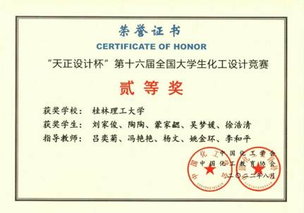 导航痕迹 当前位置: 首页 >> 教育教学 >> 化学工程专业认证 >> 正文 我院学子在2022年第十六届全国大学生化工设计竞赛中取得佳绩 由中国化工学会、中国化工教育协会、教育部高等学校化工类专业教学指导委员会主办的第十六届全国大学生化工设计竞赛华南赛区决赛由海南大学于2022年8月7日至9日进行了线上承办。 我院组织化学工程与工艺专业2019级24支队伍参加竞赛,由王桂霞、王晓娟、何方等老师组成的团队分别进行指导。2019级本科生刘家俊、陶陶、蒙家勰、吴梦媛、徐浩清组成的队伍“路人”的作品“新疆美克有限公司年产10万吨1,4-丁二醇项目”经过师生共同努力,以其出色的设计作品和精彩的线上现场答辩脱颖而出,勇夺赛区一等奖,荣获全国总决赛二等奖。我校共获得全国二等奖1项、三等奖10项、华南赛区一等奖1项、三等奖12项,在获奖比例与数量上均为历届参赛最好成绩。 通过本次比赛,全方位考查和提升了学生在化工学科领域的创新意识、对化工知识的综合运用能力,同时也进一步增强了学生的工程技能、团队协作精神、环保意识、人文关怀意识和社会责任感。 获奖情况如下: 表1 第十六届全国大学生化工设计竞赛获奖作品与成绩 序号 团队名称 设计项目名称 参赛学生 获奖等级(全国总决赛) 获奖等级(华南赛区) 1 路人 新疆美克有限公司年产10万吨1,4-丁二醇项目 刘家俊、陶陶、蒙家勰、吴梦媛、徐浩清 二等奖 一等奖 2 持酯以恒 浙石化年产 10 万吨 1,4-丁二醇项目 王俊杰、王冰、韦宏海、赵爱敏、秦亿民 三等奖 3 醇风醇粹 中国石化川维化工公司年产15万吨1,4-丁二醇项目 廖小婷、陈国胜、韦金美、莫琪琦、罗裕隆 三等奖 4 醇风得意 中科泓能(北京)科技有限公司年产4万吨1,4-丁二醇工程设计 何俊铭、原达豪、钟巧媛、李春龙、肖家锋 三等奖 5 到点吃饭 广州石化有限公司年产10万吨1,4-丁二醇项目 莫玉汁、韦琳娟、黄献丽、刘明杨、曹奥林 三等奖 6 虎虎生威 齐鲁石化年产5万吨1,4-丁二醇项目 黄悦、卢英华、薄开雯、陈鸿、吴婧喆 三等奖 7 化工工艺包 新疆库尔勒市年产12万吨1,4-丁二醇工程设计 林必贤、莫培燎、黄政大、蓝元臻、李家权 三等奖 8 卡布奇诺 新疆美克化工年产15万吨1,4-丁二醇项目 陆从昊、麻喜仪、白少帅、张倩、罗瑞梅 三等奖 9 炉火醇青 山东石化年产13万吨1,4-丁二醇项目 张阳、崔皓东、莫桂南、钟文巧、莫宗昌 三等奖 10 泉同 四川天华富邦年产12.6万吨1,4-丁二醇 秦海、覃思凯、梁之泉、覃玉镇、刘成凯 三等奖 11 糖醋排骨鱼 新疆蓝山屯河能源有限公司年产11万吨1,4-丁二醇生产分厂的设计 周朝秀、高锐、任志琦、袁全强、阮文胜 三等奖 12 无言可队 中沙(天津)石化有限公司年产10万吨1,4-丁二醇项目 李明莜、李崇媛、韦柳树、王嘉琪、袁梓慧 三等奖 13 兄弟盟 中国石化燕山石化 10 万吨/年 1,4-丁二醇生产项目 赵丽霞、何旭、刘姗姗、邓鸿、牛彬楠 三等奖 14 影拓队 年产12.5万吨1,4-丁二醇 黄广霞、覃梓红、庞诗宜、罗小燕、班静姝 三等奖 15 羽饰骑士 内蒙古君正化工有限责任公司年产6.6万吨1,4丁二醇项目 韦家宝、黄怡宁、张杰、陈俊萌、伍泓玮 三等奖 16 阿对对队 中石油克拉玛依中石化公司年产9.1万吨1,4-丁二醇项目 林情香、邓捷、于湘、张蕊、石家奇 三等奖 17 氨咘梨涡铂 陕西北元有限公司年产10万吨1-4丁二醇项目 覃紫燕、韦柳华、罗欣、梁艳颖、伍婷 三等奖 18 比比氨钼烯 内蒙古投资集团有限公司年产12万吨1,4丁二醇项目 张晓轩、杨友斌、蓝振飞、邓豪、王枫闯 三等奖 19 不酮矾响 万华化学集团股份有限公司分公司年产20万吨BDO项目 刘凤萍、谭一粟、谢冰雁、黎海兰、何婷 三等奖 20 全村的“烯”望 山西三维化工有限公司分厂年产15万吨1,4-丁二醇项目 蔡永兴、李权东、周萍、蒙石玲、李万莲 三等奖 21 全体保研 恒力石化股份有限公司分公司年产4万吨1,4-丁二醇项目 言燕美、李自强、农欣云、黄美花、张柏露 三等奖 22 豆浆烩面 顺酐加氢法年产10万吨1,4丁二醇工程设计 甘伟基、郭旭航、李秋玲、黄丹妮、余幸莲 三等奖 23 氟氯双醛 广元氟氯双醛年产10万吨1,4-丁二醇项目 周贝贝、韩蕙泽、司婷婷、冼俊成、李倩倩 三等奖 全国贰等奖获奖证书 华南赛区壹等奖获奖证书 【 发布日期:2022-12-14 浏览次数: 】 上一条:校友黎水林工程师为我院化工与制药类2022级同学作报告 下一条:我院学子参加第五届全国大学生化工实验大赛获得佳绩