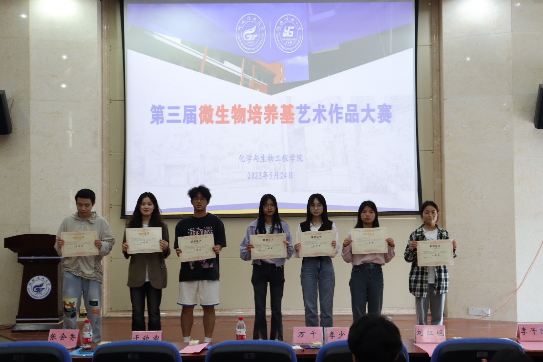 导航痕迹 当前位置: 首页 >> 教育教学 >> 生物工程专业认证 >> 正文 我院举办2023年食品安全与你同行系列比赛之第三届微生物培养基艺术作品大赛 为了普及微生物科学知识,展示多姿多彩的微生物世界,将艺术与微生物相结合,提升学生的美育能力,加强学生创新实践能力的培养。生物工程专业于2023年5月24日在我校雁山校区萃华楼报告厅成功举办了第三届微生物培养基艺术作品大赛。本次比赛于5月19日开始进行了为期5天的线上评选活动,共获得8千余张选票。5月24日现场比赛中邀请了人文素质教育教学部万千副主任、艺术学院视觉传达设计教研室主任于钦密副教授、化生学院李少华副书记和生物工程教研室刘红艳教授、李子院高级实验师担任评委。本次比赛共有全校6个学院12个专业上百人参赛,经过万千副主任前期对同学们作品设计的指导,各参赛团队经过一个月的精心准备,最后共提交了24组作品参加比赛。 比赛前李副书记介绍了比赛的意义,鼓励同学们积极参加课外活动,经过评委对实物作品、路演介绍等环节进行评比打分,结合线上投票成绩,比赛共评出一等奖1项、二等奖4项、三等奖7项。学院将推荐获奖者参加广西第五届大学生生命科学竞赛。比赛结束后万千副主任和于钦密副教授从艺术的角度为大家的作品进行了点评,为同学们参加区级比赛指明了改进完善作品的方向。 万千副主任指导比赛 作品设计海报 比赛现场 现场颁奖 比赛现场合影 【 发布日期:2023-05-26 浏览次数: 】 上一条:我院师生参加2023年广西-河北本科高校生物类教学指导委员会交流、研讨暨广西本科高校生物类学院院长联席会 下一条:我院召开生物工程专业本科生、生物与医药专业硕士研究生培养方案专家论证会