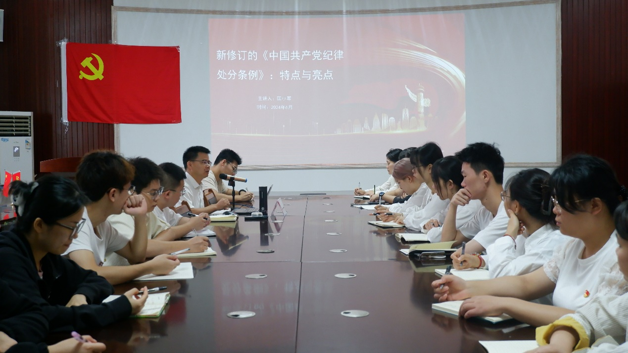 导航痕迹 当前位置: 首页 >> 党建工作 >> 党建工作 >> 正文 【党纪学习教育】学院党委副书记、院长匡小军为师生党员代表讲授党纪学习教育纪律党课 作者:熊艳 发布日期:2024-06-28 浏览次数: 6月26日,学院党委副书记、院长匡小军为师生党员代表讲授党纪学习教育纪律党课,强调要认真学习《中国共产党纪律处分条例》,推动党纪学习教育走深走实,在全院上下营造学纪、知纪、明纪、守纪的浓厚氛围。 匡小军指出,党纪学习教育是以习近平同志为核心的党中央作出的重大部署,是加强党的纪律建设、推动全面从严治党向纵深发展的重要举措。新征程上,要牢牢把握党纪学习教育的重大意义,自觉用党规党纪校正思想和行动,真正使学习党纪的过程成为增强纪律意识、提高党性修养的过程,切实把思想和行动统一到党中央决策部署上来。 匡小军强调,要通过本次学习教育把遵规守纪刻印在心,内化为日用而不觉的言行准则。要学懂弄通《条例》的主旨要义和规定要求,加强“以案说纪、以案说法、以案说德、以案说责”警示教育,推动师生党员深化对《条例》的理解领会和转化运用,促进师生党员在党纪学习教育中强化忠诚干净担当。 党课现场(一) 党课现场(二) (一审:熊艳;二审:李少华;三审:彭代江) 上一条:【党纪学习教育】学院召开党纪学习教育警示教育会 下一条:【党纪学习教育】学校党委常委、副校长黎贞崇为学院师生党员讲授党纪学习教育纪律党课