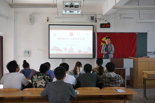 导航痕迹 当前位置: 首页 >> 党建工作 >> 不忘初心牢记使命 >> 正文 【不忘初心、牢记使命】我院本科生第一党支部开展党课学习十九届四中全会精神 作者:赖廷民、黄兆凡 发布日期:2019-11-06 浏览次数: 2019年11月5日中午,我院本科生第一党支部在06511召开了“解读十九届四中全会”学习会。本科生第一党支部全体党员及预备党员参加学习会,此次学习会由本科生第一党支部书记黄道坤主持。 会议伊始,黄道坤书记就此次十九届四中全会的深远意义及其中的重大决策进行了总结讲话。黄道坤指出,此次四中全会围绕研究坚持和完善中国特色社会主义制度、推进国家治理体系和治理能力现代化若干重大问题,作为学生党员,我们应该时刻关注国家动向,不落后任何一步,这也是我们此次学习会的目的。接着黄道坤从六大创新点向支部同志解读十九届四中全会。黄道坤强调全体党员应与党中央的决策保持高度一致,要坚持中国特色社会主义制度,认真履行自己的职责。 黄道坤书记强调,学生党员应该在学生群体中起到标杆作用,我们要做到在生活中严格要求自己,还要做到与党中央的政策及目标任务保持一致,努力提升自身的知识储备,增强文化修养。 会议现场(一) 上一条:【不忘初心、牢记使命】我院本科生第三党支部开展“解读十九届四中全会”主题学习会 下一条:【不忘初心、牢记使命】我院本科生第二党支部开展党课学习贯彻十九届四中全会精神