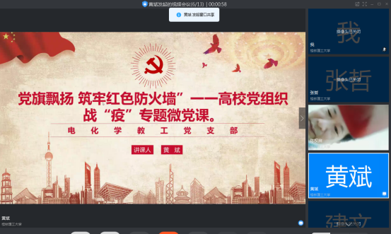 为引导支部全体党员在疫情防控中充分发挥模范带头作用,2020年6月28日上午,电化学教工党支部组织全体党员以“钉钉会议”的形式开展线上党课学习。党课主题为“党旗飘扬,筑牢红色防火墙”,党课的讲授人为电化学教工党支部书记黄斌同志。