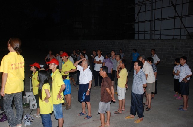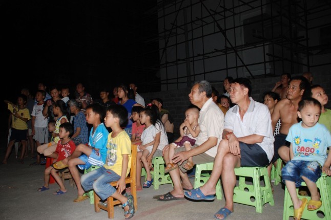 吃过晚饭,队员们就马不停蹄地点来到活动现场布置好会场,随后队员们来到镇上,引领镇上村民进入会场观看电影。在播放期间,队员们结合电影情节,向村民们讲解当年革命的情景,真实的再现了当年革命的艰辛。电影播放完毕后,实践团成员们还与现场村民进行了亲切交谈,他们都一致认为,优秀的革命精神是我们的宝贵财富,弘扬优秀的革命精神是我们当代人民的责任与义务。