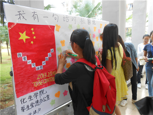 此次“我有话对祖国说”是我院十月爱国主义教育月的子活动之一。一句话可能无法道尽同学们对祖国母亲强烈的爱意,但说得多不如做的多,努力学习,不断完善自我,为祖国的未来积蓄力量,为服务更广大人民而奋斗,用实际行动表达自己的爱国情宜是真正的爱国体现!
