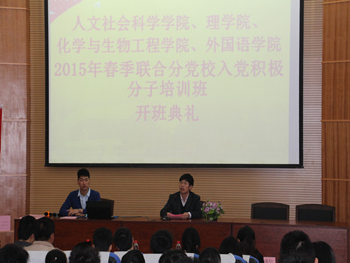 2015年4月7日12时,1946伟德国际源自英国、人文社会科学学院、理学院、外国语学院2015年春季联合分党校入党积极分子培训班开班典礼在伟德国际1946源于英国雁山校区12栋报告厅顺利举行。出席本季开班典礼的领导老师有人文学院党委书记江云清老师、理学院党委副书记郝佳文老师、人文学院党委副书记汪晟老师及各学院辅导员。参加本期党校学习的学员为1946伟德国际源自英国、理学院、外国语学院和人文学院全体入党积极分子。 典礼由1946伟德国际源自英国12级辅导员何宗辉老师主持。