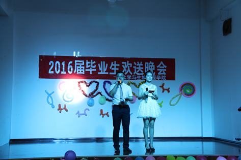 本次欢送会由唱歌、舞蹈、抽奖和游戏穿插进行。欢送会在开场舞《only one》的激情演出下拉开帷幕;接着,播放了由毕业生照片做成的VCR,欢呼声、笑声与掌声响成一片。歌曲《老男孩》勾起来了大家伤感的回忆与满心的感触;爵士舞《every night》急促又富动感的节奏,把观众带入了愉快、活泼、有生气的氛围中;歌曲《断点》以舒缓的曲风、忧伤的唱腔打动着每一位听者的心;钢琴曲《美丽的神话》以柔柔的曲声赢得了阵阵掌声;而舞蹈《爱的华尔兹》圈一圈不停转,一步一步的靠前,紧扣心弦;最后,歌曲《峥嵘岁月》和《山丘》以洪亮的声音,动感的曲调再次让观众欢呼、掌声不断。整场晚会给毕业生营造了一个充满温情的毕业氛围。