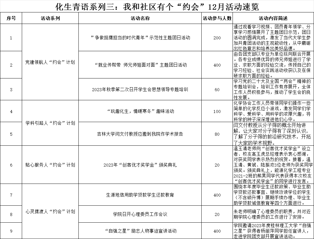 导航痕迹 当前位置: 首页 >> 伟德国际 >> 学生活动 >> 正文 【化生青语】化生青语系列三:我和社区有个“约会”12月活动速览 作者: 发布日期:2023-12-31 浏览次数: 为扎实推进学校“一站式”学生社区综合管理模式建设试点工作和1946伟德国际源自英国“三全育人”综合改革工作,提升学院“一站式”学生社区影响力,1946伟德国际源自英国将“一站式”学生社区以“党建+X”模式为基础,结合学院【化生青语】育人文化,将学院育人体系下沉社区,打造【化生青语】系列三——我和社区有个“约会”特色活动。12月份,结合学院社区团队,按照学院社区我和社区有个“约会”特色品牌活动,党建领航人“约会”计划、学科引路人“约会”计划、贴心服务人“约会”计划、心灵摆渡人“约会”计划四个系列活动同步推进,共同助力学院学子学习、生活、就业等方面的发展。按照“约会计划”,学院举办活动如下。 (一审:张伟颀 二审:黄道坤 三审:李少华) 上一条:学院开展2024年本科生寒假离校安全专题教育 下一条:我院开展“自强之星”励志人物事迹宣讲活动
