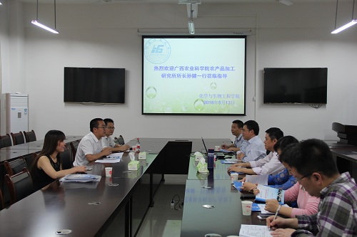 导航痕迹 当前位置: 首页 >> 招生就业 >> 就业 >> 正文 广西农业科学院农产品加工研究所所长孙健一行到访我院 作者:林文钊 发布日期:2016-05-13 浏览次数: 5 月 13 日 ,广西农业科学院农产品加工研究所所长孙健一行到访我院。学院院长李建平、副院长潘宏程、院长助理李海云等领导及部分教师代表在雁山校区 12217 会议室接待了来访客人。 座谈会上,李建平院长代表学院向客人介绍了我院在学科建设、科学研究、师资队伍建设等方面的简要情况。孙健所长介绍了广西农业科学院农产品加工研究所的基本情况。双方人员还就联合培养学生、科研合作等问题进行了深入交流和探讨,并希望今后继续深入开展交流与合作。 座谈会后,孙所长一行参观考察了我院实验室。 座谈会现场 参观实验室(一) 参观实验室(二) 合影留念 上一条:【坚持梦想,砥砺前行】2013级“传、帮、带”考研就业经验交流会(3) 下一条:我院与广东江门湖南商会举行合作签约、挂牌仪式