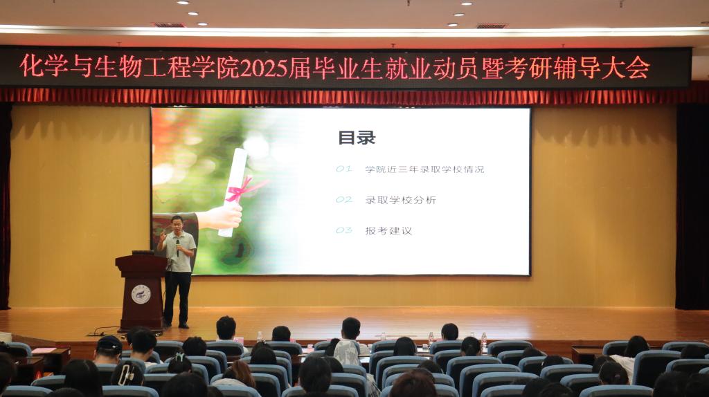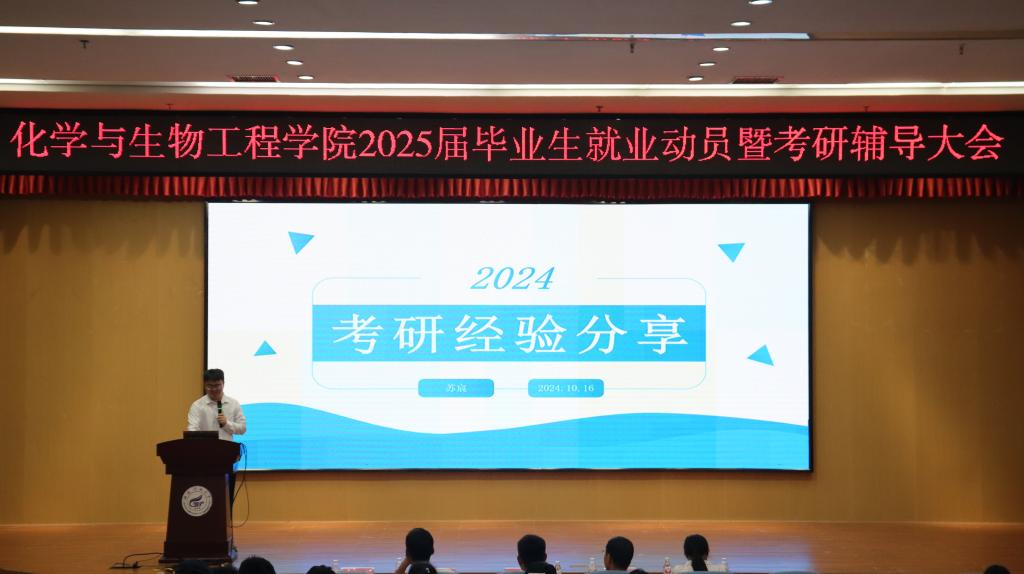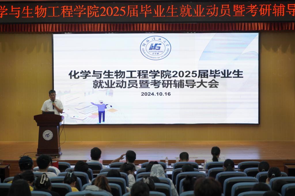 导航痕迹 当前位置: 首页 >> 招生就业 >> 就业 >> 正文 学院2025届毕业生就业动员暨考研辅导大会顺利召开 作者: 发布日期:2024-10-16 浏览次数: 10月16日中午,学院在雁山校区图书馆报告厅召开了2025届毕业生就业动员暨考研辅导大会。学院党委书记彭代江,院长匡小军,党委副书记李少华,副院长李霞、何方、孔翔飞出席,2021级辅导员陈千癸、2024届优秀毕业生苏宸及2025届本科生参加。 会上,学院党委书记彭代江发言。彭书记强调了就业和考研对于同学们个人成长和未来发展的重要性,提醒同学们在面对就业市场时要保持积极主动的心态,不仅要密切关注行业动态,更要不断提升自我,增强竞争力,以最佳状态迎接未来的挑战。同时,彭代江对2025届学子提出了三点要求:一是要坚定信念,不忘初心,始终保持对梦想的执着追求;二是要勤奋学习,提升自我,用知识和能力武装自己;三是要勇于担当,甘于奉献,以高度的责任感和使命感回馈社会。他希望,同学们在追求梦想的过程中,要保持良好的心态和健康的身体,以坚定的信念和不懈的努力,实现自己的人生目标。 学院党委副书记李少华结合学院近三年的就业数据对当前就业市场的特点和趋势进行了分析。他指出,同学们要树立正确的就业观,根据自身实际情况,精准定位,脚踏实地,不盲目追求不切实际的目标,一步一个脚印地为自己的未来努力拼搏。学院副院长孔翔飞从学院近三年考研报考及录取情况出发,为同学们提供了考研院校选择策略。他指出,同学们要合理评估自身水平,结合往年考研形势,确立符合自身的目标,提升考研成功率。 随后,往届毕业生苏宸分享了他的考研经验,他鼓励考研同学们要相信自己,勇敢追梦,争取“一战上岸”。2025届毕业生代表陈陶作了就业表态发言,他代表毕业生表示,在人生新的征程上要积极转变心态,努力提升技能,不断充实自我,在未来的路上稳步踏实前行。会上,学院还为2025届考研学子发放了慰问品。 此次就业动员暨考研辅导大会不仅为2025届毕业生提供了宝贵的就业指导和考研建议,也进一步增强了大家的信心和决心。学院将继续关注毕业生的就业和考研情况,提供全方位的支持和服务,助力同学们实现美好未来。 学院党委书记彭代江发言 学院党委副书记李少华作就业形势分析 学院副院长孔翔飞作考研报考院校分析 2024届优秀毕业生作考研经验分享 (一审:陈千癸 ;二审:黄道坤; 三审:李少华) 上一条:学院召开2024年大学生职业规划大赛动员大会 下一条:学院举办2025届就业引航宣讲会,助力学子从容迎就业