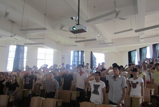 导航痕迹 当前位置: 首页 >> 新闻资讯 >> 学院新闻 >> 正文 化生学院2013届毕业生党员教育实践活动之一――“牢记身份,重温誓词”活动 作者: 发布日期:2013-06-22 浏览次数: 6月20日,我院在雁山校区05101教室成功开展了毕业生党员重温入党誓词活动。学院全体毕业生党员、预备党员参加了此次活动,会议由学院党委胡祖生书记主持。在胡书记的带领下,全体起立,面对着鲜红的党旗,同志们高举右手,庄严宣誓 “我志愿加入中国共产党,拥护党的纲领,遵守党的章程,履行党的义务……”。宣誓结束后,胡书记发言,他寄语毕业生党员,勉励大家在未来的工作生活中,要坚持理想、时刻牢记党员身份,自觉加强学习,虚心探索,务实肯干,积极关注民族命运,勇于承担时代责任,时刻心系祖国发展。作为国家的建设者和民族的接班人,真正做到敢于有梦、勇于追梦、勤于圆梦,为中华民族的伟大复兴作出自己应有的贡献。活动在一片掌声中圆满落下帷幕。毕业生党员纷纷表示,在今后的工作生活中一定牢记党员身份,以身作则、踏实工作,以实际行动回报母校。重温入党誓词现场 上一条:我院圆满完成2013届研究生各项毕业工作 下一条:化生学院2013届毕业生党员教育实践活动之四――“牢记身份,毕业生党校”活动