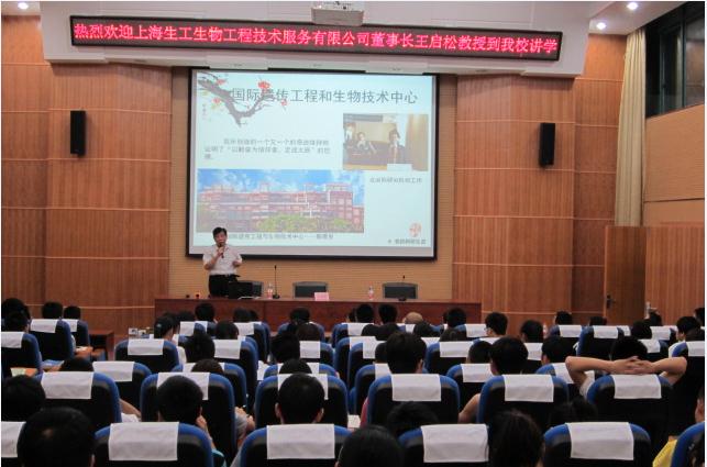 导航痕迹 当前位置: 首页 >> 新闻资讯 >> 学院新闻 >> 正文 上海生工生物工程技术服务有限公司董事长王启松教授到我院讲学 作者: 发布日期:2013-06-20 浏览次数: 6月18日晚,上海生工生物工程技术服务有限公司董事长王启松教授应邀在雁山校区12号楼矿冶中心学术报告厅为我院学生做了一场题为“以勤奋为信仰者,定成大器”的人生哲学演讲报告。化生学院院长李建平教授和院长助理海洪副教授与200多名学生一同聆听了报告,本次报告由学院团委书记周德海老师主持。报告会上,首先李建平院长对王启松教授的到来表示热烈的欢迎,并向同学们简单介绍了王教授,同时希望在座的同学们能认真聆听王教授的报告,收获人生的真谛。随后,王教授围绕学生时代、科研生涯、从商经历、四个希望、21世纪生物技术发展及创业五个方面向同学们进行演讲。王教授用通俗易懂、幽默风趣的语言讲述了自己的亲身经历,意义深远,让同学们收获颇丰。在互动环节,王教授对同学们的问题一一进行了解答,并提出针对性意见,让同学们对未来更加有信心。最后,周德海老师发言,他说道王教授的人生阅历十分丰富,带给同学们的不仅是专业知识的学习、了解,更多的是对人生哲学的思考,并希望同学们能够铭记王教授的指导,以勤奋为信仰,珍惜大学时光,收获充实的人生。 报告会现场 上一条:化生学院隆重举行2013届毕业生欢送大会 下一条:我院召开本科专业人才培养方案修订审核答辩会