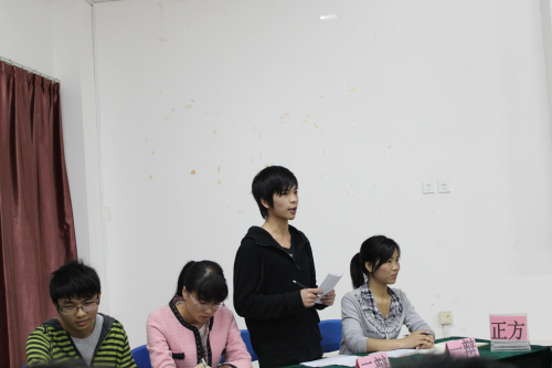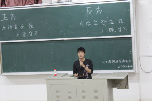 导航痕迹 当前位置: 首页 >> 新闻资讯 >> 学院新闻 >> 正文 我院成功举办趣味辩论赛 作者: 发布日期:2013-04-17 浏览次数: 4月15日晚7点,以“大学生是否应该上晚自习”为辩题的趣味辩论赛在雁山校区05314教室举行。学院饶筠筠老师、杨建辉老师、何宗辉老师以及09级优秀学生代表秦冬霞同学与12级全体同学一起观看了本次辩论赛。比赛开始之际,主持人介绍了辩论赛的流程。紧接着何老师对此次辩题发表了自己的看法,晚自习是为同学们提供自主学习的平台,有利于同学们养成良好的学习习惯,希望同学们好好利用晚自习的时间。辩论赛开始之后,场上双方辩手你来我往,充分发挥自己的智慧和能言善辩的技巧,就各自的观点展开了激烈的争辩。辩手们出色的口才,敏捷的思维和巧妙的逻辑推理,赢得场下同学的阵阵掌声!辩论赛后,今年考上了华南理工大学硕士研究生的秦冬霞同学分享了她的学习心得,她通过自己的经历给同学们讲了大学生应该如何利用好晚自习的时间,强调了晚自习的重要性,并希望在场的同学们能够珍惜大学时光。最后,辩论会在同学们的阵阵掌声中圆满结束!本次趣味辩论赛,旨在引导同学们充分认识学校早晚自习制度的用意,从被动转变为主动,更能够合理安排好时间,提高学习效率,营造良好的学习氛围。何宗辉老师发言辩论赛现场 辩手风采 上一条:资助育人,感恩回馈――化生学院举办优秀毕业生学习经验交流会 下一条:活力青春,谁与争锋----我院成功举办“化生杯”篮球赛