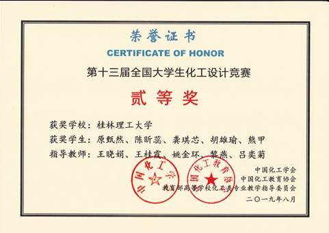 由中国化工学会、中国化工教育协会、教育部高等学校化工类专业教学指导委员会主办的第十三届全国大学生化工设计竞赛今年8月份分别在华侨大学、中北大学进行了华南赛区决赛、全国总决赛。我院一共组成化学工程与工艺专业32支队伍参加竞赛,由李和平、王桂霞、王晓娟、吕奕菊、黎燕、姚金环、杨文、冯艳艳、刘峥、及方华、何方、王永涛等老师组成的团队分别进行指导。经过师生的共同努力,2016级化工16-3班和卓越班的学生原甄然、龚琪芯、熊甲、胡雄瑜、陈昕蕊组成的“昕芯相烯,雄熊然酯”团队进入华南赛区决赛,该团队提交设计的作品“天然气乙炔气相法年产35万吨醋酸乙烯项目”以其出色的设计作品和精彩的现场答辩脱颖而出,获得华南赛区壹等奖,并荣获全国总决赛贰等奖。同时,我院参赛队伍还获得全国叁等奖13项、华南赛区贰等奖5项、叁等奖3项。我校化工专业学生较好地理解了本次大赛的主题,工程设计能力得到了总体提升。获奖情况如下: