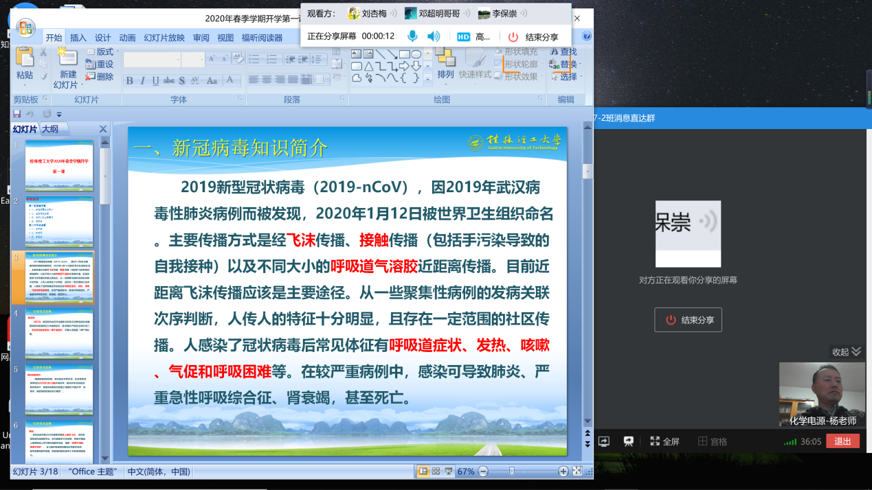 为更好的推进疫情防控工作以及确保同学们“停课不停学”,结合学生工作部(处)制作的新冠肺炎宣讲课件、宣讲提纲以及我院实际情况,学生工作领导小组积极谋划,各年级辅导员和各班班主任认真准备,开学第一周通过线上召开主题班会。