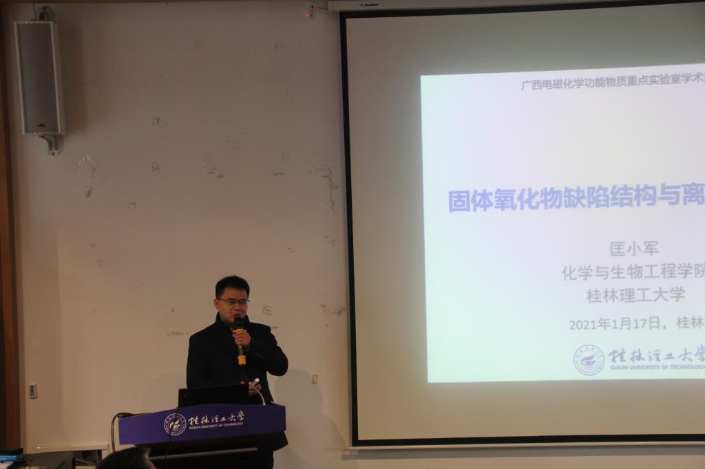 2021年1月17日,我院举办的广西电磁化学功能物质重点实验室学术交流报告会在屏风校区科创中心学术报告厅顺利召开。学校副校长、广西电磁化学功能物质重点实验室主任梁福沛教授出席并在开幕式上致辞,学院全体专业教师参加了此次会议。