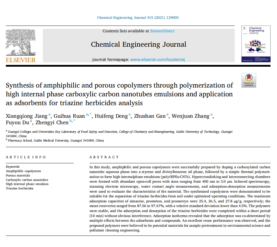 2021年春季学期开学前夕,我院阮贵华研究员团队在多孔聚合物材料的制备及其应用研究传来好消息,其团队的研究成果——题为“Synthesis of amphiphilic and porous copolymers through polymerization of high internal phase carboxylic carbon nanotubes emulsions and application as adsorbents for triazine herbicides analysis”的论文被化学工程类国际知名期刊Chemical Engineering Journal(IF=10.652)录用并正式发表。