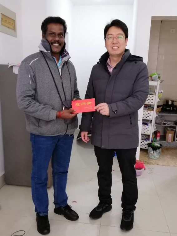 导航痕迹 当前位置: 首页 >> 新闻资讯 >> 学院新闻 >> 正文 我院看望慰问部分留校过年教师代表 作者:林文钊 发布日期:2022-01-18 浏览次数: 春节临近之际,1月18日上午,我院党委委员、副院长刘勇平等领导代表学院看望慰问部分留校过年的教师代表:雷呈宏教授、Chandru博士、邱福荣博士等。 在慰问过程中,刘勇平副院长详细了解受慰问老师的工作、生活以及公寓安全情况,向他们讲解了目前学校开展的疫情防控工作和相关要求等。刘勇平副院长代表学院对他们一年来为学院建设发展所付出的辛勤劳动表示感谢,鼓励他们今后再接再厉,争取更优异成绩,为学院和学校的建设发展贡献更大力量。最后,刘勇平副院长代表学院向他们拜早年,并送上慰问金和新春佳节美好祝福。 刘勇平副院长(左)在慰问雷呈宏教授(右) 刘勇平副院长(右)在慰问Chandru博士(左) 刘勇平副院长(左)在慰问邱福荣博士(右) 上一条:学校党委常委、副校长梁福沛出席我院2022年战略研讨会 下一条:学校保卫处到我院进行实验室安全检查