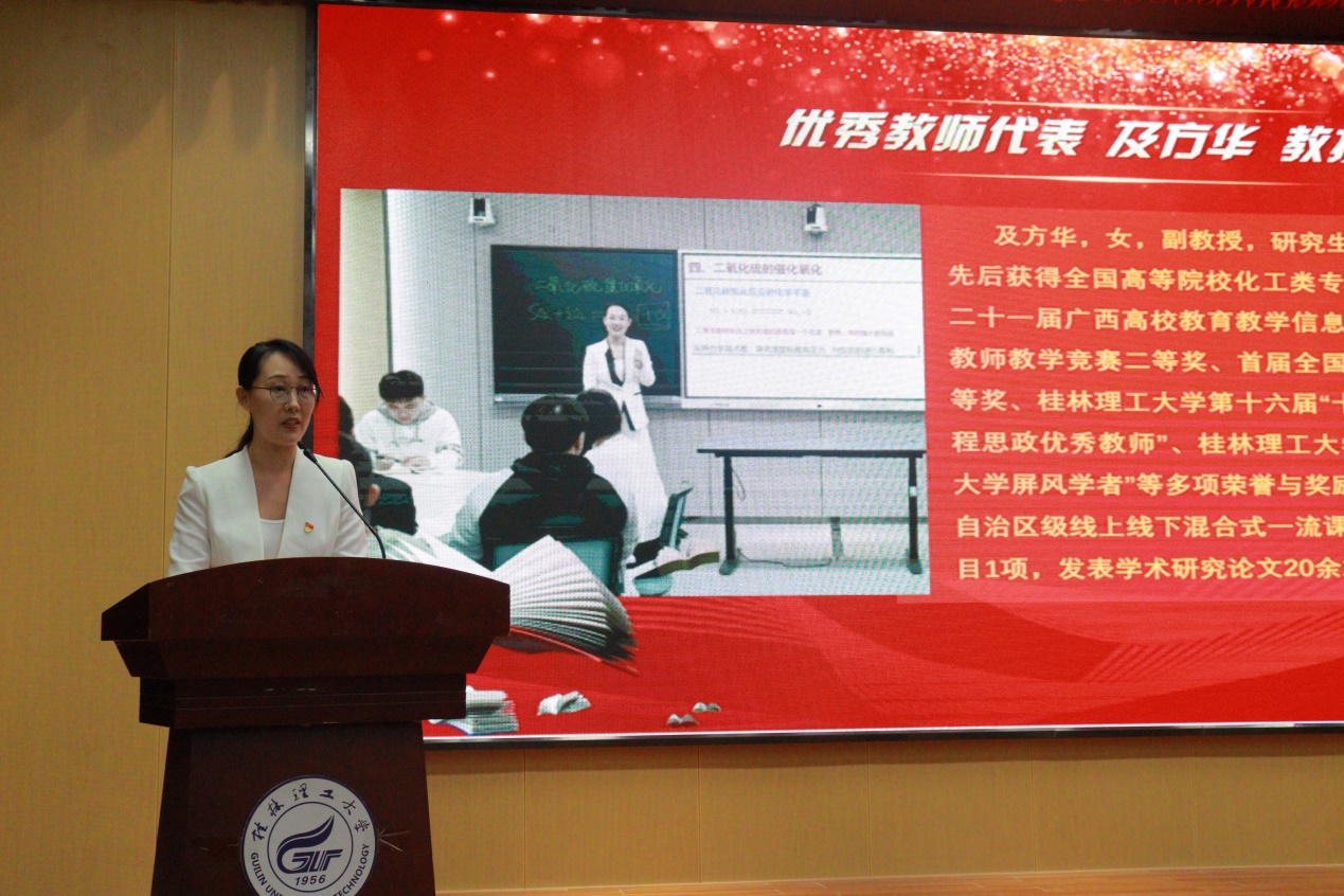 导航痕迹 当前位置: 首页 >> 新闻资讯 >> 学院新闻 >> 正文 躬耕教坛 强国有我--1946伟德国际源自英国庆祝2023年教师节活动 作者:刘耀明 发布日期:2023-09-11 浏览次数: 为深入贯彻落实习近平新时代中国特色社会主义思想和党的二十大精神,充分展现新时代新征程高质量教师队伍建设的突出成就和广大教师立德树人、自信自强的精神风貌,化生学院以迎接党的二十大胜利召开后的第一个教师节为契机,于9月8日下午在雁山校区图书馆报告厅开展以“躬耕教坛 强国有我”为主题的教师节庆祝活动。学校党委常委、副校长王玫、学院党委书记彭代江、院长匡小军以及学院全体教师、学生代表等220余人参加了本次活动。 活动伊始,学校副校长王玫发表了热情洋溢的致辞,他带领大家一同回顾了1946伟德国际源自英国过去一年在党建、学科专业建设、教学、科研等方面取得的成绩,指明了化生学院未来的发展方向和重点工作,并对全院教师提出了三点希望:一是以政治建设为统领,加强党的建设,聚势谋远;二是以立德树人为根本,加强内涵建设,凝聚合力;三是以精耕细作为要求,增强实干意识,全员争先。 随后,化生学院院长匡小军宣读了《关于学院表彰“从教三十年、二十五年、二十年、十五年、十年教师”及教书育人、科研育人、管理育人、就业工作突出贡献奖的决定》,并进行了表彰活动。 会上,优秀教师代表及方华老师分享了从教多年来的心得感悟,同时学生们怀着感激、感恩的心,借此机会对他们敬爱的老师进行深情告白,师恩难忘,同学们的健康成长,学有所成也是老师们最大的愿望。 本次庆祝教师节活动的举办,对于深入学习贯彻习近平总书记在中共中央政治局第五次集体学习和在北京育英学校考察时的重要讲话精神,深刻认识在教育强国、科技强国、人才强国建设中肩负的光荣使命与重大责任,以人民教育家为榜样,牢固树立“躬耕教坛,强国有我”的志向与抱负,以培养堪当民族复兴大任的时代新人为己任,全员全方位全过程强化师德养成,争做“四有”好老师和“四个引路人”,努力培养更多德智体美劳全面发展的社会主义建设者和接班人。 王玫副校长致辞 匡小军院长讲话 颁奖 优秀教师代表及方华发言 合影留念 上一条:我院召开2023年秋季学期师德师风警示教育会议 下一条:我院召开2023年秋季学期全院教职工大会