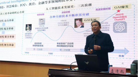 导航痕迹 当前位置: 首页 >> 新闻资讯 >> 学院新闻 >> 正文 集美大学原校长李清彪教授应邀到我院作学术报告 作者:马文硕 发布日期:2024-12-31 浏览次数: 2024年12月30日下午,集美大学原校长李清彪教授应我院邀请,在雁山校区图书馆报告厅作了题为“浅议生成式AI对科学研究的影响及其应用”的精彩报告。此次报告由我院院长匡小军教授主持,全校两百余名师生现场参加了学术报告会。 报告会上,李清彪教授以其深厚的学术造诣和前沿视野,深入剖析了生成式人工智能的崛起背景、演进脉络、应用领域及研究趋势。报告结合国内外高校调研数据、实际案例,使参会人员对生成式AI与高校人才培养、科学研究的关系有了更加全面深入的认识和思考。他指出,在生成式AI热潮下,人才培养和科学研究都需要与时俱进,教育工作者需要不断更新自己的知识体系,掌握最新的教育技术和方法,培养学生的批判性思维和创新能力,以适应新技术带来的挑战和机遇。 李清彪教授引用了大量国内外最新的研究,内容既前沿又充实,论述深入浅出,生动有力,让在场的每一位师生都深受启发。匡小军院长在总结时指出,李清彪教授的报告内容丰富、观点前瞻,对教师的教学改革和科学研究提供了有力的指导和启示。教学和科研工作要紧密结合AI技术发展趋势,将AI技术融入自己的教学和科研工作中,不断探索创新,为教育事业的发展贡献力量。 李清彪教授讲座 匡小军院长主持讲座 讲座现场 (一审:马文硕 二审:何方 三审:匡小军) 上一条:南宁师范大学化学与材料学院到我院开展参观交流 下一条:化生学院开展实验室安全检查与整改