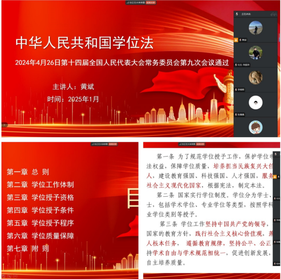 2024年4月26日第十四届全国人民代表大会常务委员会第九次会议表决通过《中华人民共和国学位法》(以下简称《学位法》),自2025年1月1日起实施。为全面学习和贯彻《学位法》精神,结合关于做好《学位法》学习宣传与贯彻实施的通知要求,进一步推动我院研究生教育工作的法治化、制度化和规范化,我院特别组织了以各科室为学习小组的全员覆盖学习模式,深入学习《学位法》。 此次学习活动不仅涵盖了《学位法》的基本原则和核心内容,各科室还通过组织教职工观看《学位法》实施核心问题首场研讨会直播,深入探讨了学位授予的基本条件、资格审查、评审程序以及质量保障措施等。通过此次学习,学院各科室老师们纷纷表示将严格按照《学位法》的相关要求,规范教学行为,提高教学质量和学业成绩,为学生的学业发展和学位授予奠定坚实的基础。 此次《学位法》专题学习的意义在于进一步强化我院师生的学术规范意识,确保学位授予的质量与规范性,促进我院研究生教育的高质量发展。 一审:李美静 二审:马文硕 三审:孔翔飞