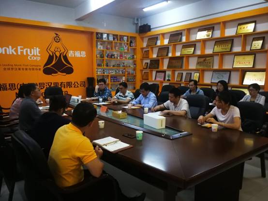 4月24日上午,在李建平院长带领下,生物工程教研室海洪教授等一行9人到桂林吉福思罗汉果有限公司参观交流。首先参观了桂林吉福思罗汉果有限公司成果和荣誉展示厅,接着与吉福思总裁蓝福生以及公司相关管理人员进行了座谈。